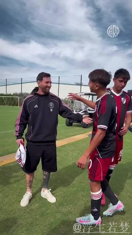 世界杯足球赛场上的梅西与少年球员